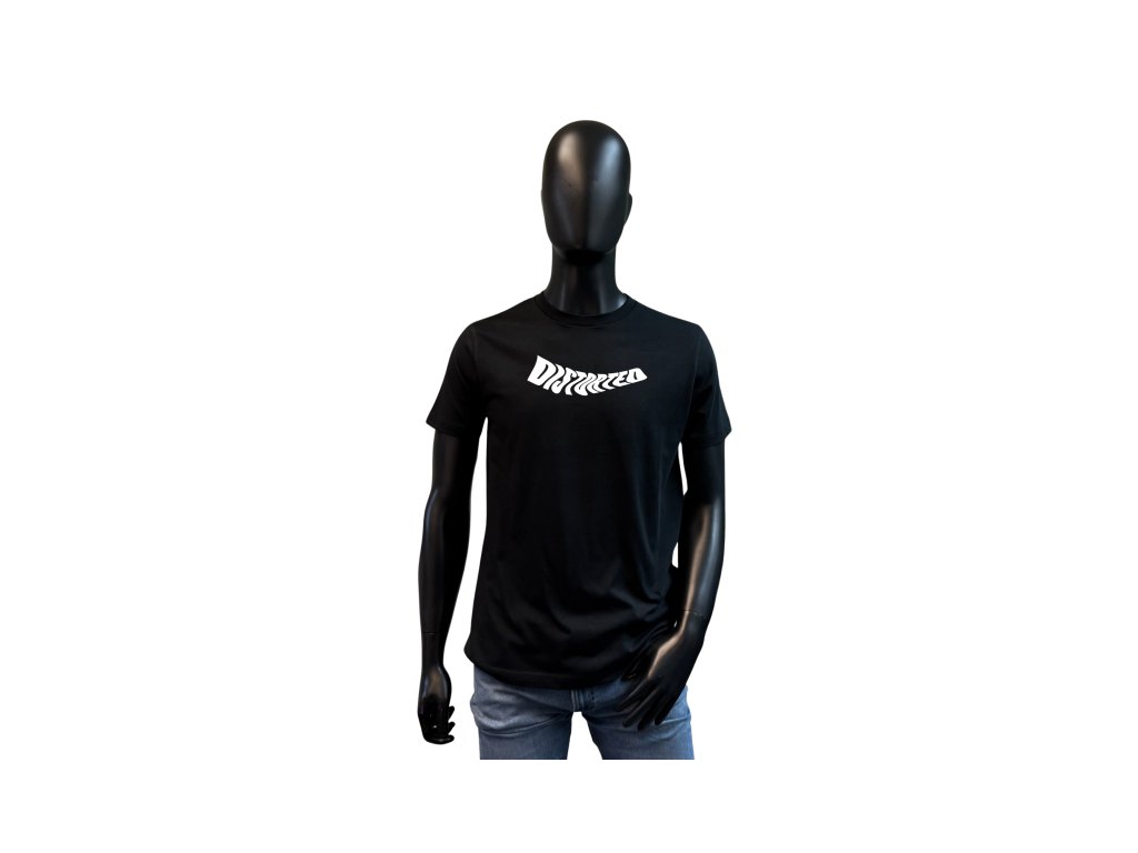 V temnotě vynikne tvar. Černé tričko s nápisem motivu DISTORTED, který deformuje realitu i pravidla.