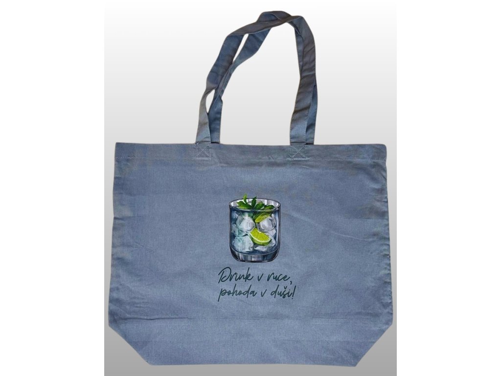 Lehká a prostorná taška z organické bavlny v barvě dusty blue. Potisk s osvěžujícím drinkem a nápisem Drink v ruce, pohoda v duši vám dodá dobrou náladu každý den.