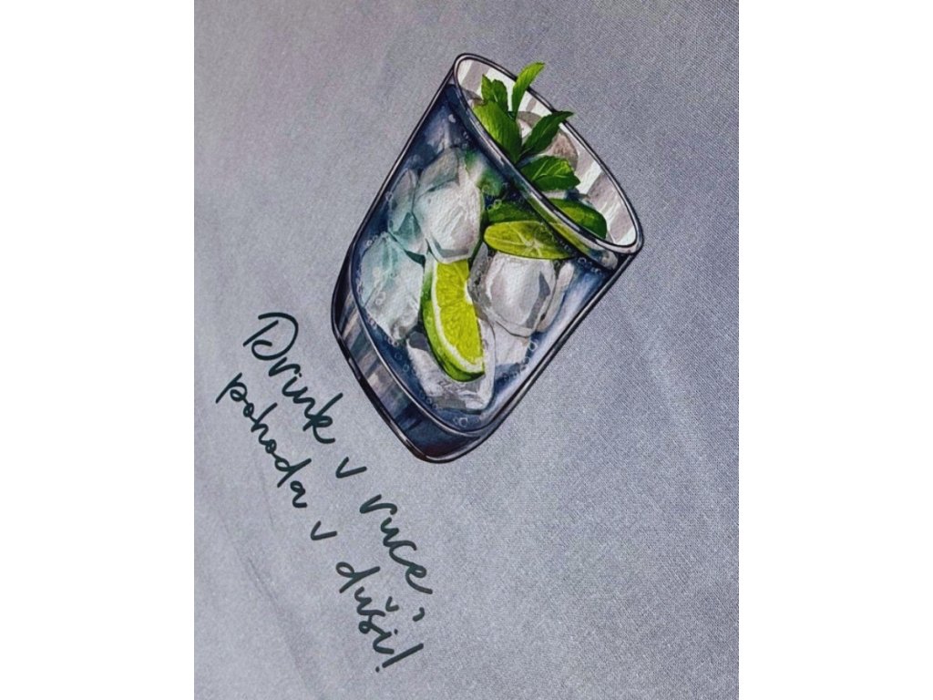 Trendová barva dusty blue působí příjemně a nadčasově, zatímco originální design s drinkem plným ledu a nápisem Drink v ruce, pohoda v duši vám připomene, že život je i o malých radostech.